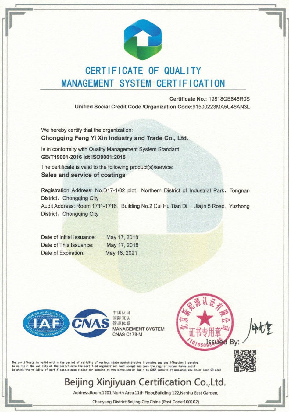 • 熱烈祝賀重慶峰易昕工貿有限公司